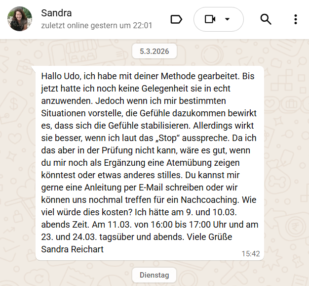 Mach Schluss mit Blackouts, Prüfungsangst und inneren Blockaden – Lerne, deine Nervosität zu regulieren und selbstbewusst in jede Prüfung und Präsentation zu gehen. Soforthilfe – individuell, schnell, unkompliziert via WhatApp.